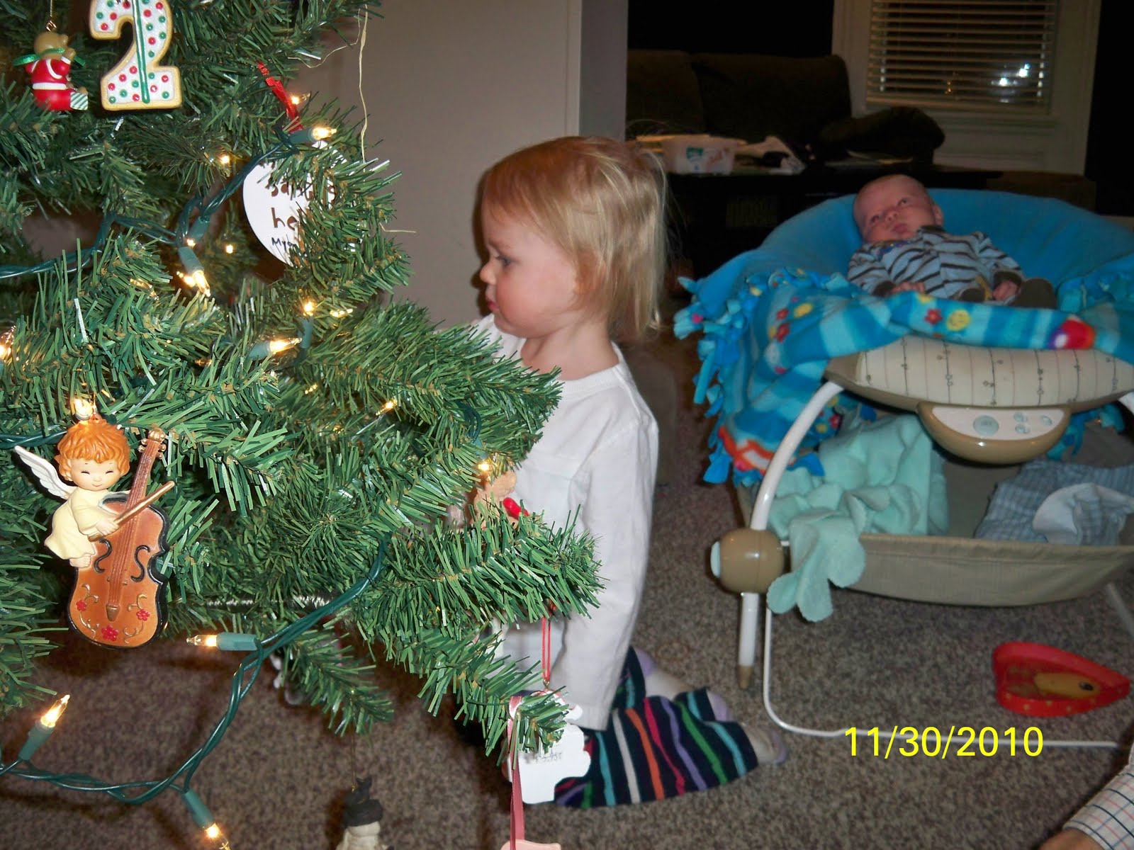 Above is a picture of Mya's section of the tree. She has a limited area of what she can reach obviously, so all of her ornaments found themselves in this little section of the tree. She had so much fun though. So far she likes the "God" ornament best, but we are repeatedly telling her it's not God, it's Santa. :)